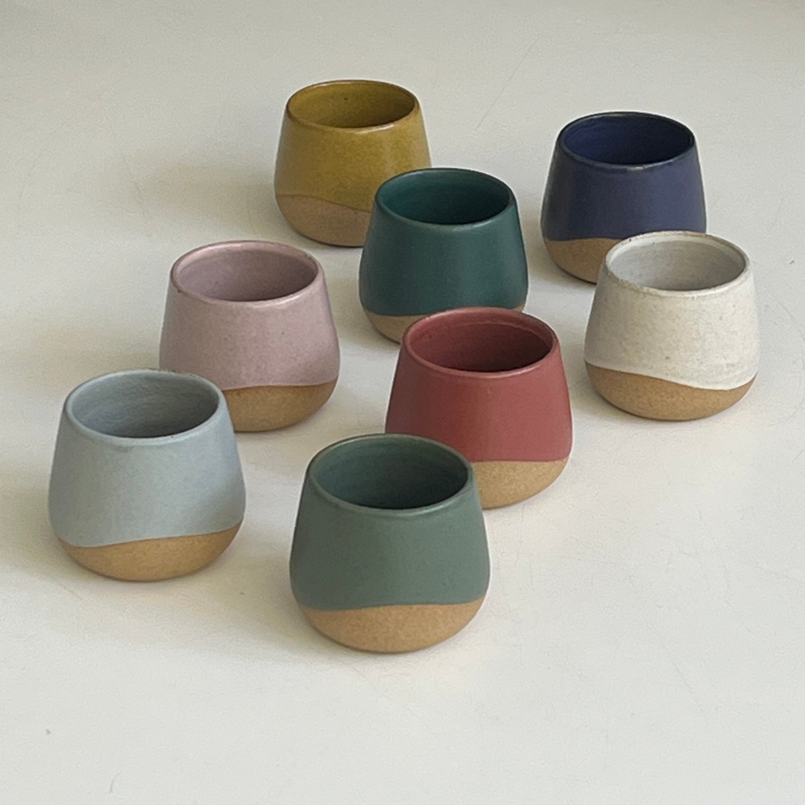 Peças modeladas em torno elétrico, produzidas com argila e esmaltes para alta temperatura.