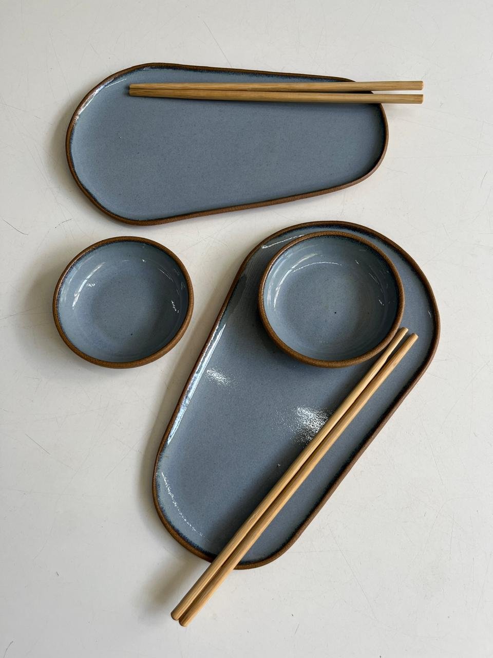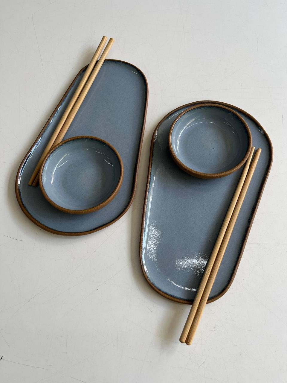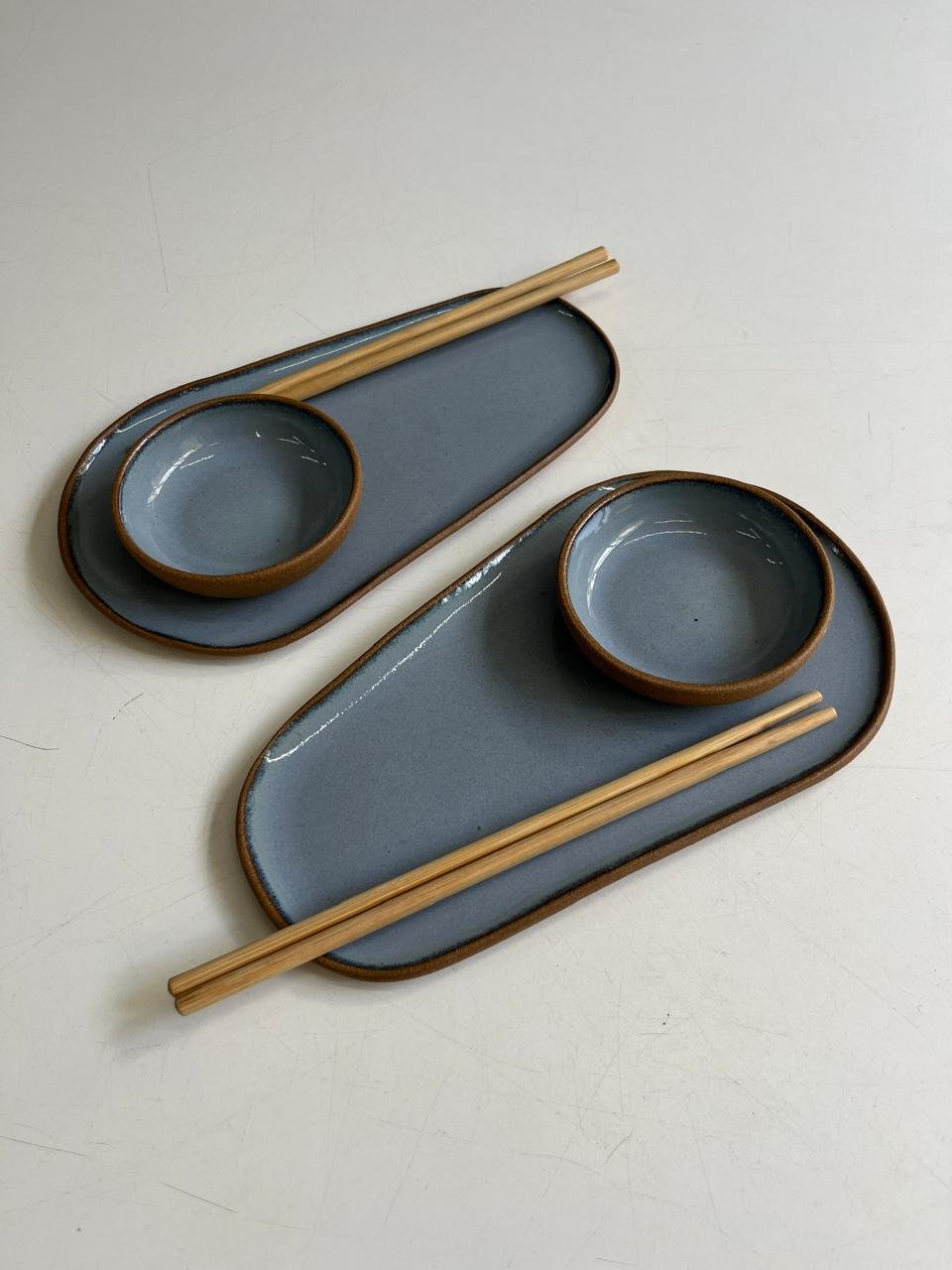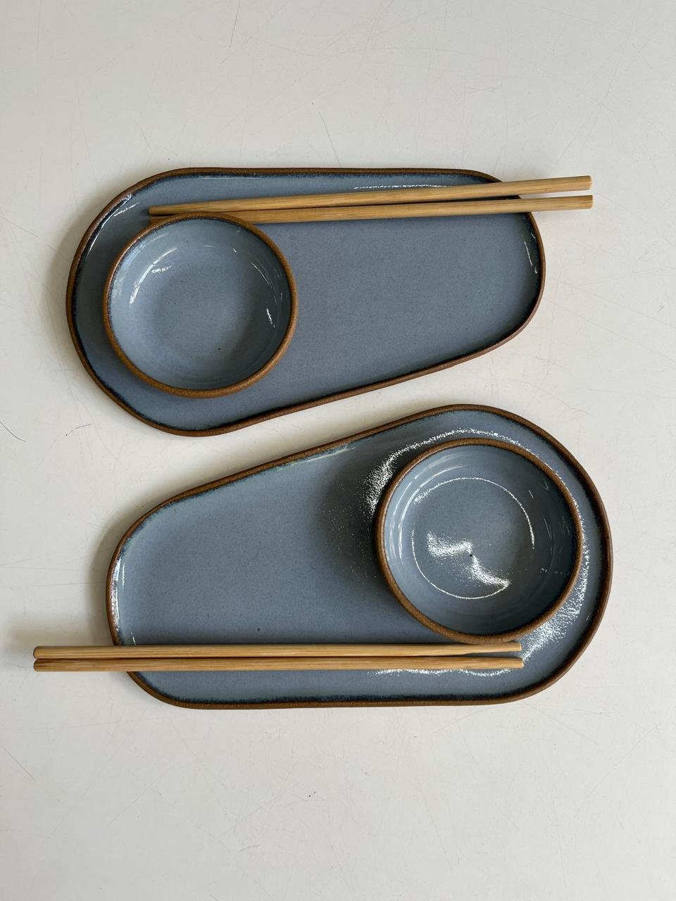 Dois pratos para sushi, medidas aproximadas 26cmx15cm, altura 1,5cm.